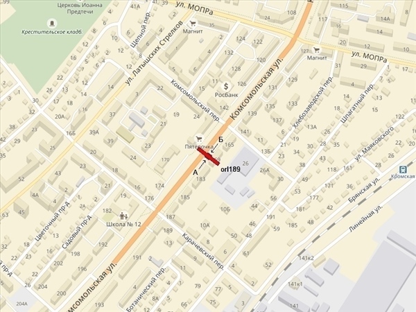 Комсомольская ул., 169, 400м до пересечения с ул. МОПРа, спрва при движении в центр (сторона Б - 850м до автовокзала, при движении из центра, к ТМК "Гринн" и ТЦ "Линия")