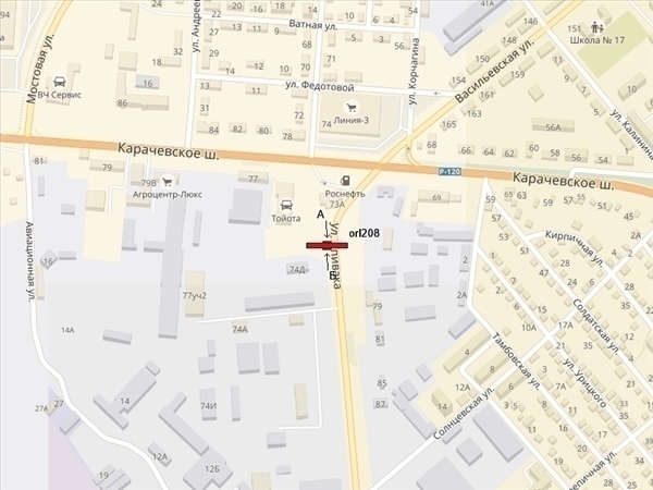 Спивака ул., 74д, 150м от Карачевского шоссе, справа при движении к Комсомольской ул. (сторона Б - 150м до гипермаркета "Линия" и АЗС "Роснефть")