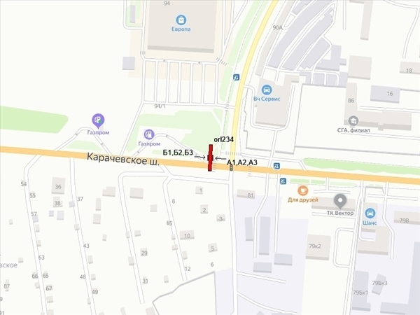 Карачевское шоссе, 92, пересечение с ул.Мостовая, у АЗС "Газпром" и гипермаркета "Европа", справа при движении из города